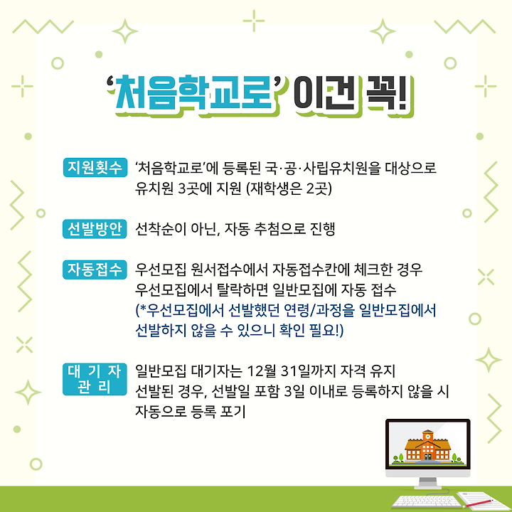 처음학교로 서비스 일정과 이용방법을 소개하는. 2023 처음학교로 신청하기. 1 처음학교로 우선모집 일반모집 일정 자격 신청방법.